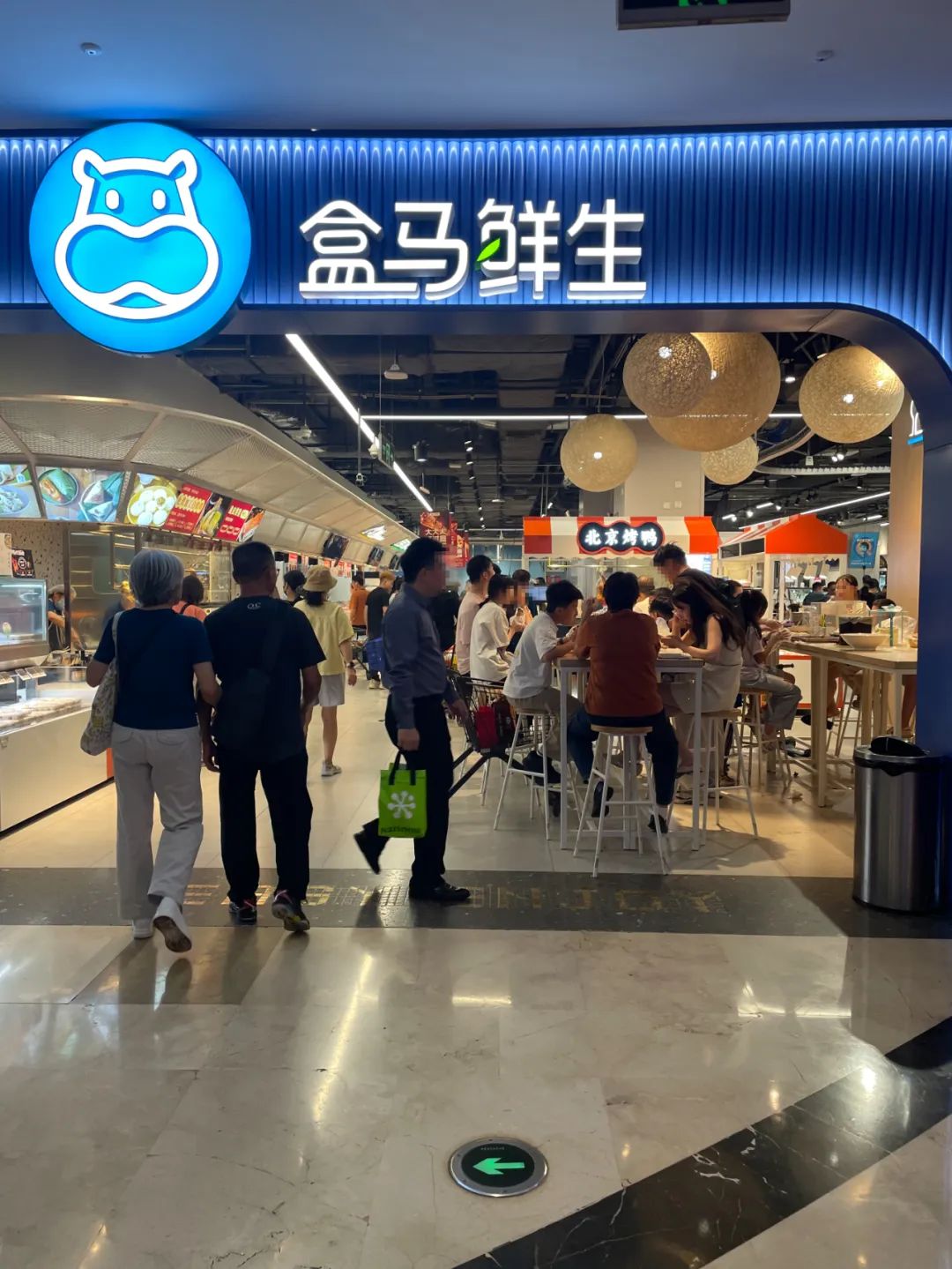 樓下的盒馬鮮生,人不少,用餐區(qū)也坐滿了人。