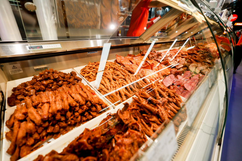 熟食明檔:醬牛肉紋理分明、熱鹵肥腸咕嘟冒泡、小龍蝦堆成小山,還有那整顆榴蓮果肉做的千層蛋糕……全是硬菜!