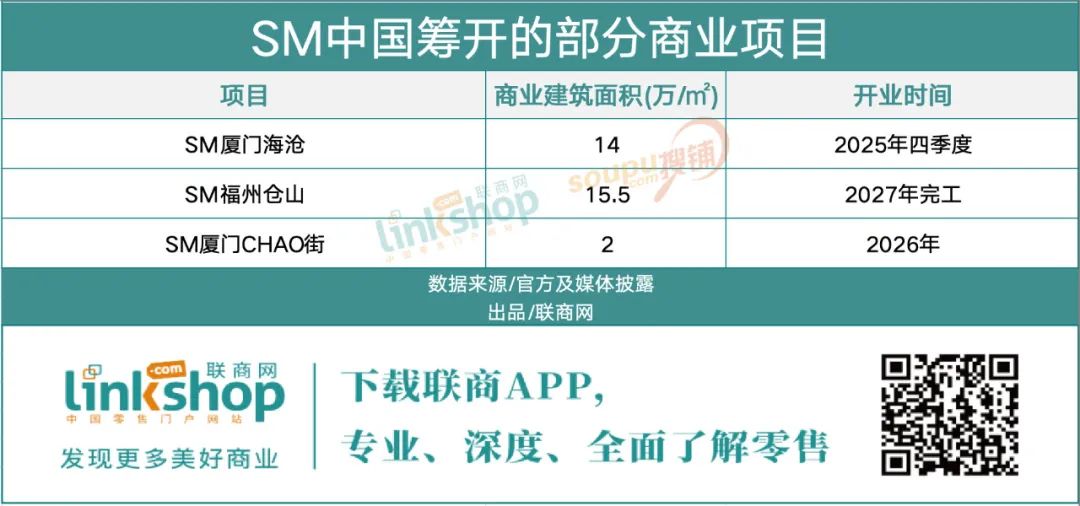 同時,SM中國目前籌備中的商業(yè)項目還有SM廈門海滄、SM福州倉山以及其在中國的首個非標(biāo)商業(yè)SM廈門CHAO街。