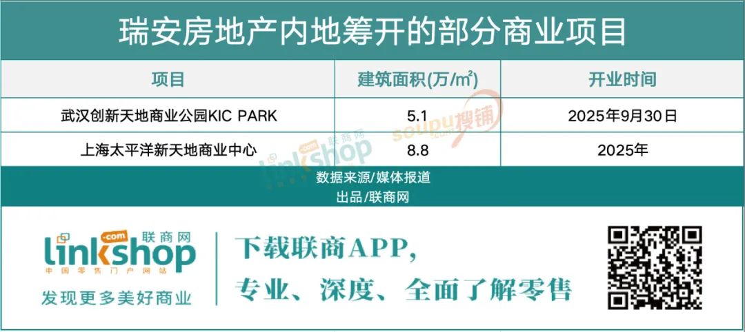 截至目前,瑞安在內(nèi)地已經(jīng)運營了23個商業(yè)體,包括上海虹橋天地、上海瑞虹天地月亮灣、上海瑞安鴻壽坊等等。在建的項目包括武漢創(chuàng)新天地商業(yè)公園KIC PARK、上海太平洋新天地商業(yè)中心。