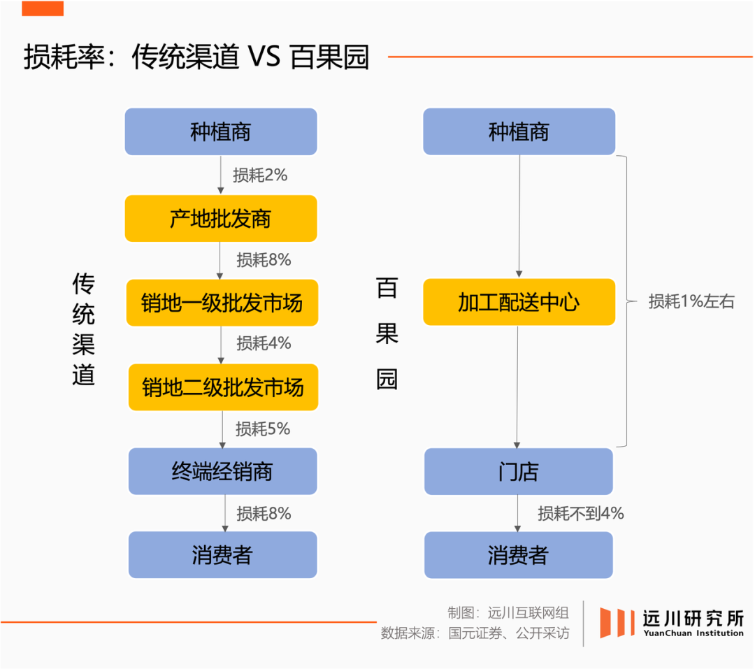 二是降低上游損耗。以往從種植商流轉(zhuǎn)到經(jīng)銷商手里,至少要經(jīng)過(guò)三層批發(fā)商,百果園是源頭直采,然后配送至門店,當(dāng)行業(yè)的損耗率高達(dá)35%時(shí),百果園自稱能控制到5%以內(nèi)[1],一舉拿下行業(yè)最大的掣肘。