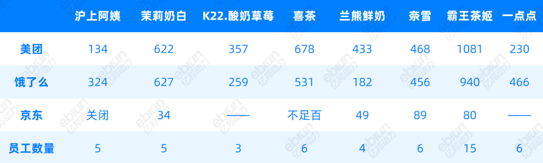 截止到8月7日晚六點,據(jù)億邦動力不完全統(tǒng)計,北京豐科萬達的滬上阿姨店,餓了么共計324單,美團134單,加上小程序一共做500多單,五位店員平均每人至少做100杯。茉莉奶白店餓了么訂單更多,5位店員平均每人至少做200杯以上。霸王茶姬訂單總量最高,美團餓了么京東分別為1081單、940單和80單。