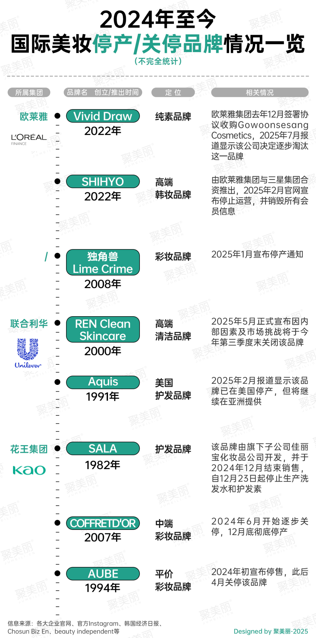 如上圖所示,關(guān)停品牌的事件并不僅僅發(fā)生在歐萊雅身上,聯(lián)合利華、花王集團等同樣在今年宣布關(guān)停多個化妝品牌。