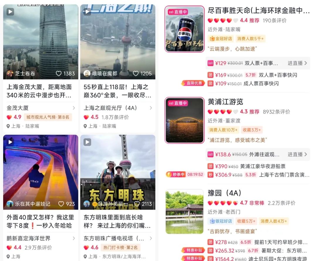 抖音平臺上,探店博主分享的“漂亮飯”新餐廳,左下角就有“2人套餐”的購買鏈接。用戶刷到虎跳峽和賽里木湖的美景視頻,搜索關(guān)鍵詞就能找到旅行攻略和景區(qū)門票、住宿的相關(guān)團購?fù)扑],用一次說走就走的旅行證明自己“不白活”。