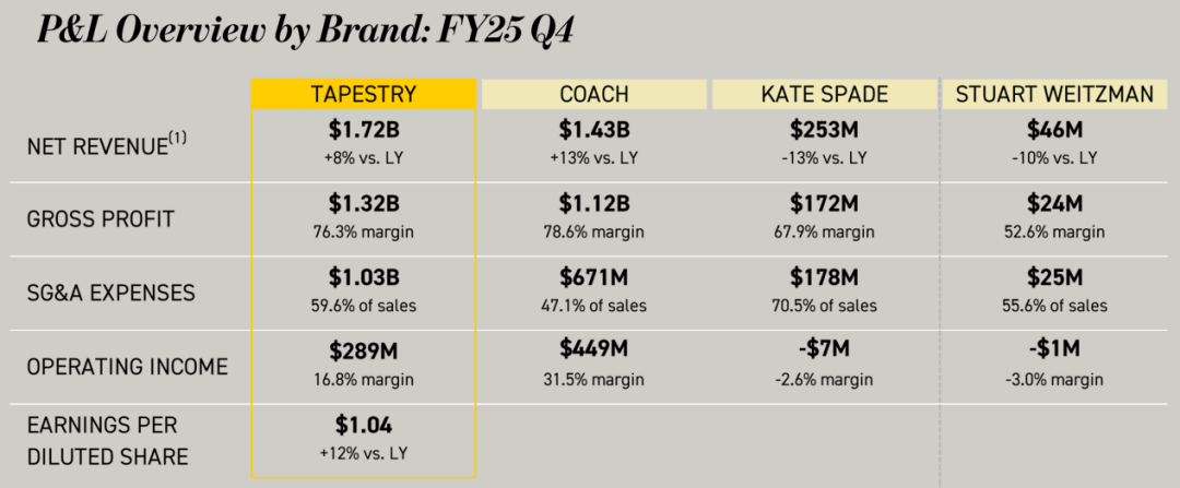 另一邊,截至6月28日的2025財(cái)年第四季度 ,Coach母公司Tapestry凈銷售額則同比增長(zhǎng)8%至17.2億美元,全財(cái)年增長(zhǎng)5%至70.1億美元。其中,占集團(tuán)銷售額約80%的Coach,第四季度增長(zhǎng)13%,全財(cái)年增長(zhǎng)10%。