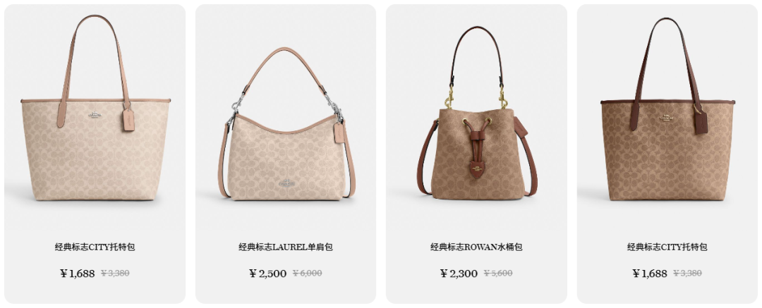 即便是社媒平臺(tái)上經(jīng)常被盤(pán)點(diǎn)的“Coach里好看又可以背一輩子的包包”,例如經(jīng)典的City托特包、Laurel單肩包、Rotvan水桶包等,在官網(wǎng)奧萊中已經(jīng)打出4-5折,最高價(jià)不超過(guò)2500元;但在其他促銷活動(dòng)和折扣平臺(tái)上,價(jià)格還可下降,甚至來(lái)到三位數(shù)的中低段。