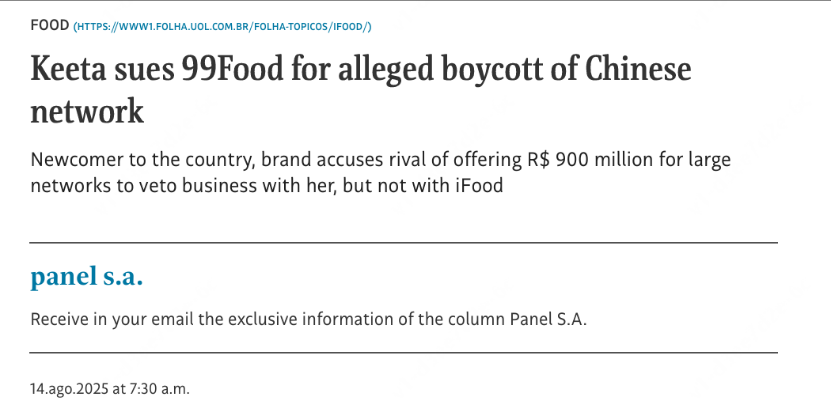 據(jù)媒體報(bào)道,今年6月下旬,巴西當(dāng)?shù)刈悦襟w率先爆出,滴滴的99Food,與當(dāng)?shù)夭糠种B鎖參與商戶取得接觸,提供給單個(gè)商戶提供數(shù)百萬(wàn)元的現(xiàn)金激勵(lì)(預(yù)付款),簽訂針對(duì)美團(tuán)Keeta的限制性合約。部分合約內(nèi)容顯示,禁止商戶與美團(tuán)Keeta合作,但可以繼續(xù)和巴西本國(guó)的iFood外賣平臺(tái)合作。