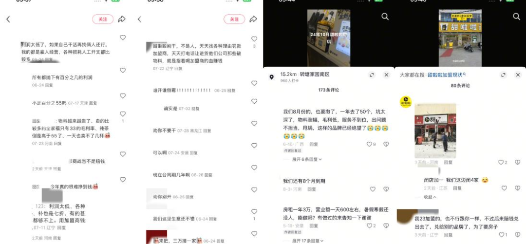 成本高、營收不穩(wěn)定、保護(hù)弱、負(fù)擔(dān)重、品牌支持有限,多重壓力疊加導(dǎo)致加盟商盈利困難,投資回報(bào)預(yù)期下降。網(wǎng)絡(luò)上已開始出現(xiàn)加盟商公開“勸退”的聲音,這對品牌的招商吸引力和市場信心構(gòu)成了直接的打擊。