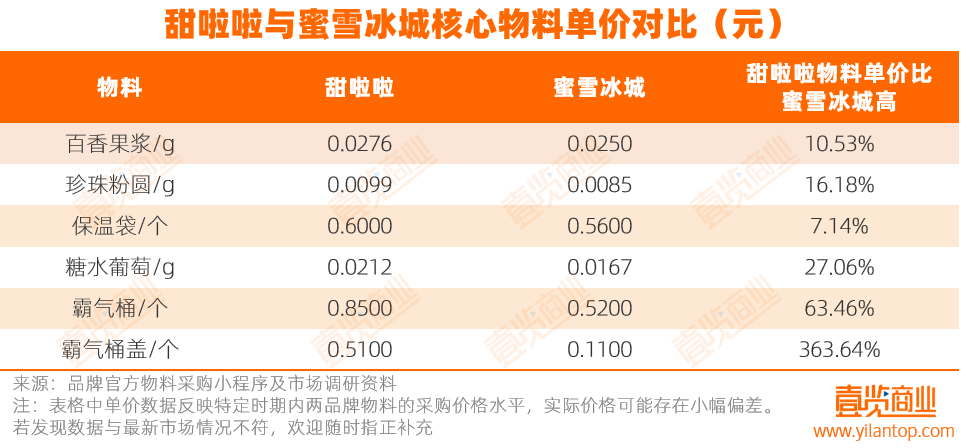 這直接導(dǎo)致其物料成本高企,并將持續(xù)性的成本劣勢固化在商業(yè)模式中。壹覽商業(yè)獲取的加盟商物料價(jià)格對比顯示,甜啦啦關(guān)鍵原料及包材價(jià)格普遍高于蜜雪冰城,部分包材價(jià)差甚至高達(dá)數(shù)倍。
