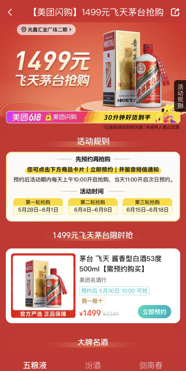 今年美團618期間,美團閃購與茅臺合作推出1499元飛天茅臺搶購活動:消費者需先預約再搶購,點擊商品卡片“立即預約”并關注短信通知,活動期內(nèi)每日10:00開啟當日搶購、11:00開啟次日預約,共分三輪(5月28日-6月1日、6月4日-6月9日、6月15日-6月18日);搶購商品為53度500ml飛天茅臺醬香型白酒,由美團名酒行提供,承諾假一賠十、官方嚴選保障正品。