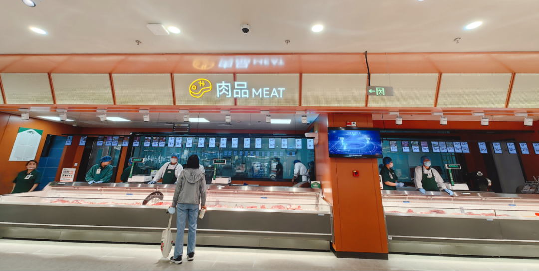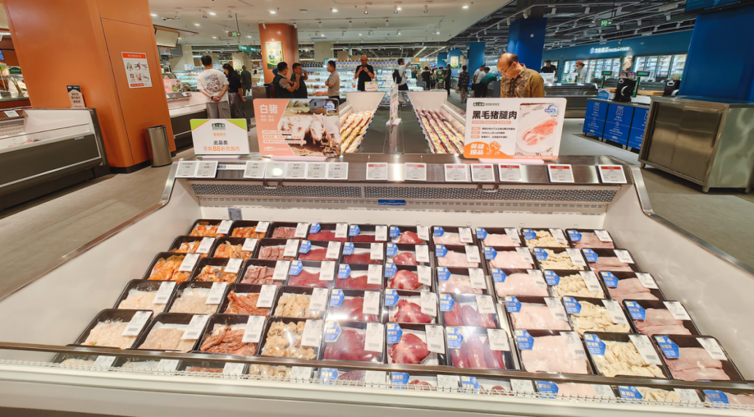 肉品區(qū)的新鮮度肉眼可見,豬肉來自江蘇沭陽黑豬基地,采用“熱氣鮮殺”工藝,屠宰后4小時(shí)內(nèi)直達(dá)門店,工作人員現(xiàn)切現(xiàn)賣。