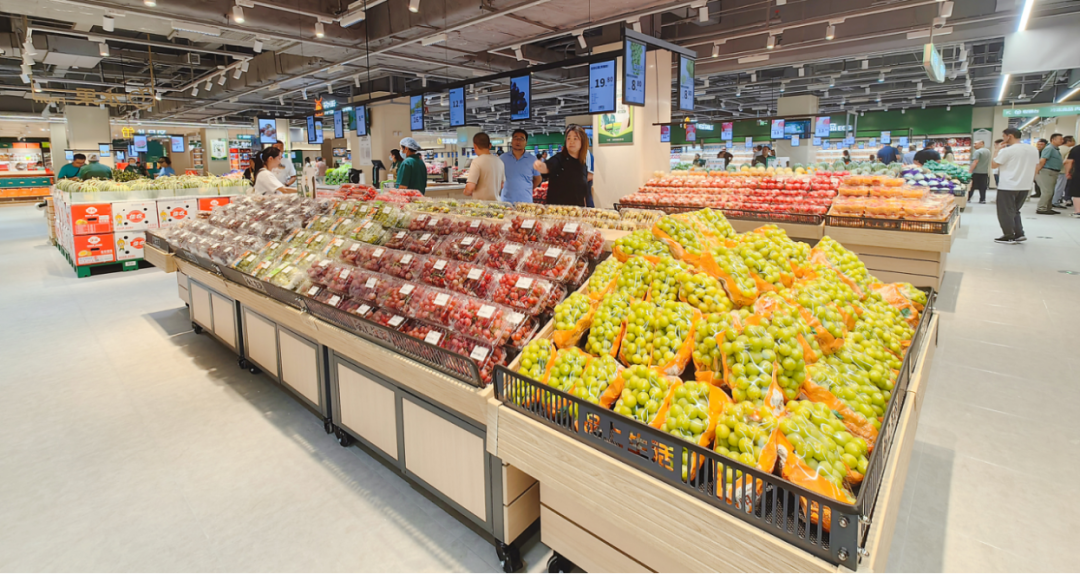 水果區(qū)設(shè)在動(dòng)線最前端,整箱獼猴桃堆頭帶來強(qiáng)烈的量感與品質(zhì)沖擊力,火龍果、哈密瓜、西梅、進(jìn)口蜜桔、葡萄等精品及季節(jié)性水果品項(xiàng)豐富,質(zhì)感突出。