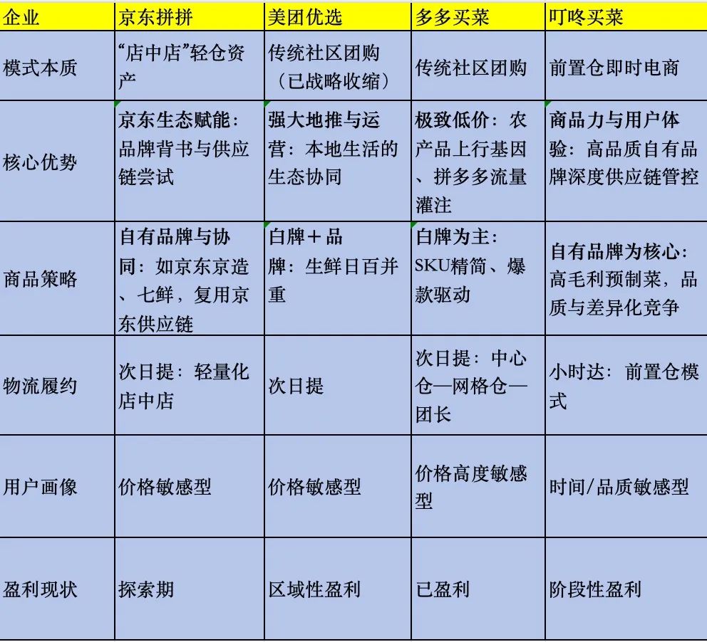 盡管京東精心籌備著“卷土重來(lái)”,但當(dāng)下的社區(qū)團(tuán)購(gòu)賽道里,頭部效應(yīng)顯著。京東拼拼希望瞄準(zhǔn)細(xì)分戰(zhàn)場(chǎng)和差異化模式,尋求可持續(xù)的立足點(diǎn)。其與多多買(mǎi)菜、美團(tuán)優(yōu)選等巨頭的較量,將是一場(chǎng)關(guān)于供應(yīng)鏈深度、模式效率與區(qū)域運(yùn)營(yíng)韌性的長(zhǎng)期考驗(yàn),而非簡(jiǎn)單的價(jià)格火拼。
