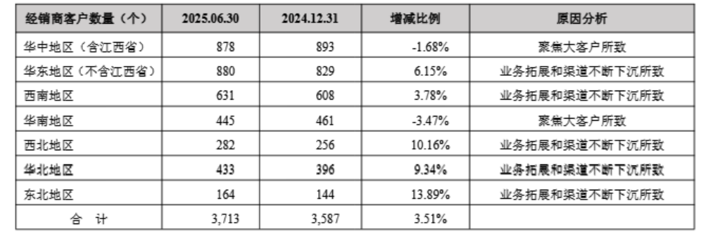 截至2025年6月30日,公司有經(jīng)銷商3713家,較2024年底的3587家,增加了126家。其中,華東地區(qū)(不含江西。┙(jīng)銷商數(shù)量最多,半年間共計新增51家至880家。