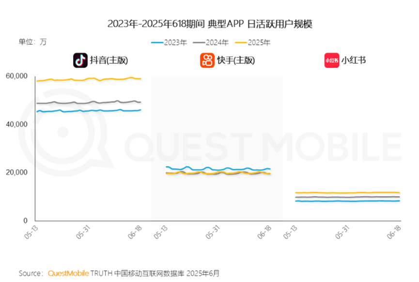 不過遺憾的是,布局電商業(yè)務(wù)十余年,小紅書仍未成為中國重量級的電商平臺。QuestMobile披露的《2025年618洞察報告》顯示,2023年-2025年各年618,小紅書的月活僅為1億左右,遠(yuǎn)低于淘寶、拼多多、抖音等平臺。