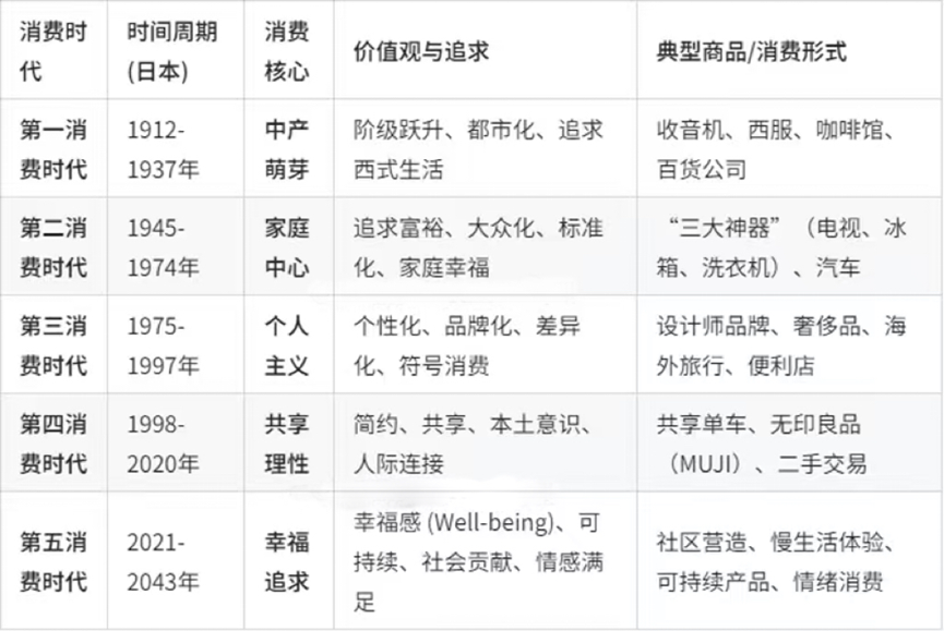 何謂五個(gè)消費(fèi)時(shí)代?根據(jù)三浦展的論述,五個(gè)消費(fèi)時(shí)代的消費(fèi)特征(以日本為例),可以歸納為如下: