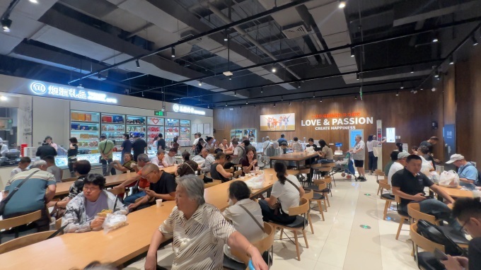 調(diào)改后的魯谷店,用空間重構(gòu)詮釋著“減法哲學(xué)”。超市集中在二層,經(jīng)營(yíng)面積大幅優(yōu)化縮減,卻通過(guò)貨架高度降低至1.6米、主通道拓寬至3.5米,讓購(gòu)物動(dòng)線更流暢、視野更開(kāi)闊。一層及二層部分區(qū)域引入餐飲及生活服務(wù)配套商業(yè),北京稻香村的糕點(diǎn)、清真美食與鄉(xiāng)村基等中式現(xiàn)炒誘惑十足,與健身房、藥店、干洗等多類(lèi)型業(yè)態(tài)形成互補(bǔ),構(gòu)成“一刻鐘便民生活圈”的核心節(jié)點(diǎn),滿(mǎn)足顧客日常生活多樣需求。