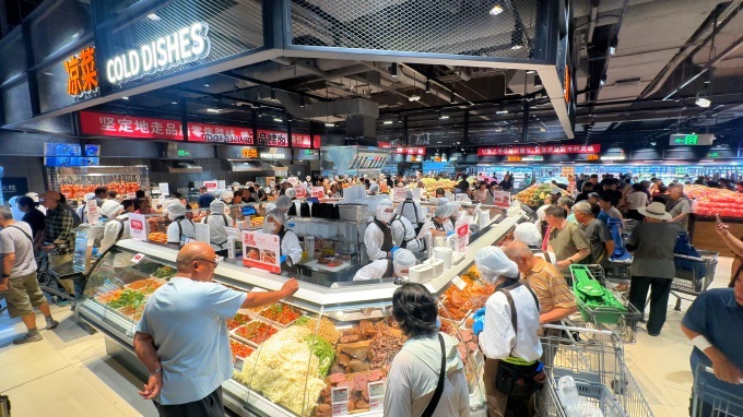 針對(duì)顧客本地口味需求突出的特點(diǎn),門(mén)店特意擴(kuò)充了老北京特色商品矩陣:平谷大桃從采摘到上架不超過(guò)24小時(shí),龐各莊西瓜甜度數(shù)值清晰可見(jiàn);本地風(fēng)味炸糕、驢打滾、艾窩窩每日新鮮現(xiàn)做,全聚德、月盛齋、大紅門(mén)、義利、北冰洋、牛欄山等老字號(hào)品牌商品一站式購(gòu)齊。年輕消費(fèi)者也能找到歸屬感,山茶花山泉吐司、“豐收的喜悅”歐包等“現(xiàn)烤現(xiàn)賣(mài)”柜臺(tái)前常排起長(zhǎng)隊(duì),多口味奶油杯、牛乳蛋糕魯谷店獨(dú)家供應(yīng),北京烤鴨推出“半只裝”,貼心滿(mǎn)足小家庭需求,這些細(xì)節(jié)調(diào)整讓“家門(mén)口的超市”既有煙火氣,又不失新鮮感。