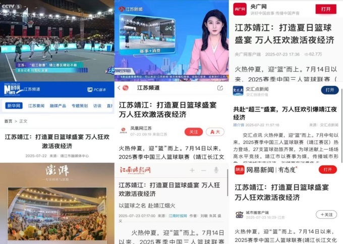 其中“賽事+消費(fèi)”模式成就了城市級(jí)文體旅商融合典范。當(dāng)下“蘇超”的熱潮席卷江蘇,靖江敏銳把握機(jī)遇通過(guò)舉辦2025賽季中國(guó)三人籃球聯(lián)賽(靖江站),以“歡聚仲夏夜”為主題,形成“賽前聚集-賽中沉浸-賽后消費(fèi)-文旅延伸”的完整價(jià)值鏈條。央視等全國(guó)10余家官方媒體聚焦報(bào)道靖江長(zhǎng)江文化中心。抖音活動(dòng)話題曝光量超2300萬(wàn),單日登頂泰州熱榜第一。