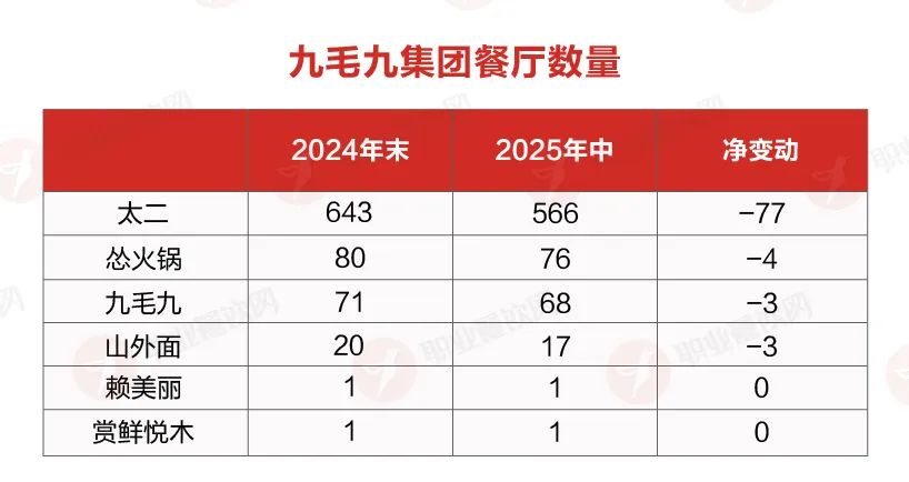 這背后,正是同店銷售的持續(xù)承壓。2025 年上半年,太二同店銷售下滑 19.0%,慫火鍋跌 20.1%,九毛九餐廳亦降 19.8%。