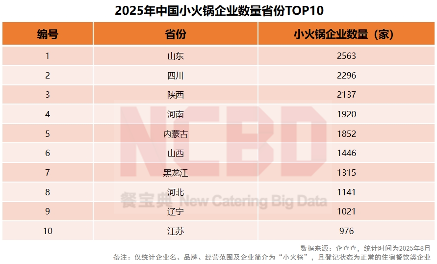 (3)從小火鍋企業(yè)數量來看,山東超過2500家,位居全國第一;四川、陜西兩省均超過2000家,分別位居二、三位;前十省份的小火鍋企業(yè)數量占全國總量的73.4%