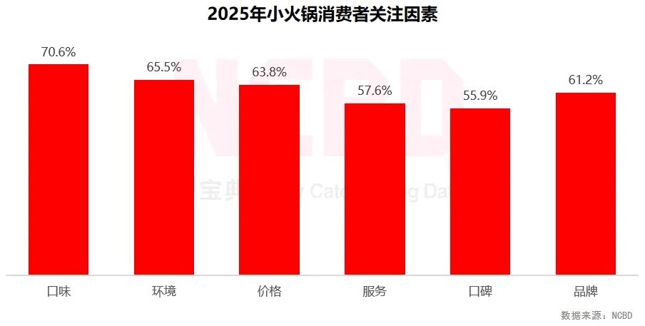 (6)小火鍋消費者除了關注菜品和價格外,對用餐體驗也有較高要求。消費者在選擇時,首要關注的是口味,占比70.6%;其次為環(huán)境和價格,占比為65.5%和 63.8%
