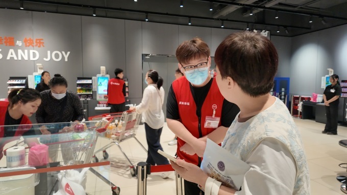 細(xì)節(jié)處更具人文關(guān)懷:在調(diào)味品等貨架旁放置放大鏡方便年長顧客,連卷袋處配備濕手器便于取用,散裝食品區(qū)標(biāo)注“一斤約多少個(gè)”的參考信息,果切組合按甜度提示食用順序,家居衛(wèi)生用品和結(jié)賬處增設(shè)粉色連卷袋。停車場服務(wù)同步升級(jí),購物車可推行至廣場全域,統(tǒng)一著裝的服務(wù)人員不僅引導(dǎo)停車,還會(huì)主動(dòng)幫助老人拎重物、為帶孩子的家庭推送購物車,贏得顧客頻頻點(diǎn)贊。