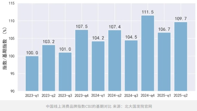 首先是如果以2023年Q1為基數(shù)100,會(huì)發(fā)現(xiàn)整體的CBI指數(shù)呈現(xiàn)上漲趨勢(shì),同時(shí)每個(gè)季度的指數(shù)都在同比持續(xù)增加。比如2023年的Q2、2024年Q2、2025年Q2,相對(duì)基數(shù)一路走高,已經(jīng)上漲到了109.7。