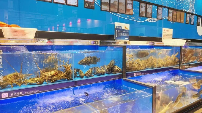細(xì)節(jié)之處盡顯巧思:調(diào)味品貨架旁的放大鏡,讓老年顧客清晰查看配料表;連卷袋區(qū)的濕手器,解決“拆袋手滑”痛點(diǎn);散裝食品標(biāo)注“1斤≈XX個(gè)”,果切組合按甜度標(biāo)明從高到低的食用順序,連毛巾襪子區(qū)都備有隔離袋,避免與生鮮交叉。肉禽柜臺(tái)可提供切絲、絞肉等服務(wù),海鮮區(qū)則為帝王蟹、波龍等高端品類配備清洗打氧設(shè)備。水產(chǎn)區(qū)員工笑言:“我們希望顧客買(mǎi)到的不僅是商品,更是省心。”