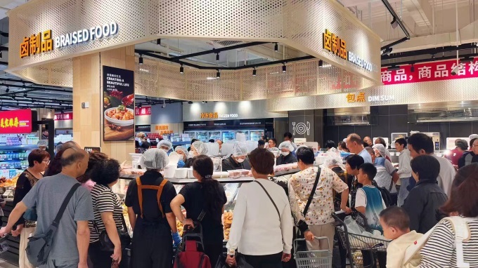 門(mén)店革新不止于商品,環(huán)境與服務(wù)同樣實(shí)現(xiàn)“體驗(yàn)躍遷”。顧客一踏入店內(nèi),首先感受到的是空間的通透與開(kāi)闊——取消強(qiáng)制動(dòng)線,主通道大幅拓寬至3米;中島貨架高度從原先的2-2.4米統(tǒng)一降至1.6米,層數(shù)也由8-9層精簡(jiǎn)至5-6層,極大改善了視覺(jué)通透性與選購(gòu)便利性。