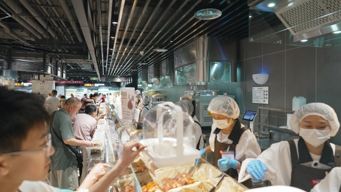 步入熟食烘焙區(qū),各類檔口煙火氣十足。現(xiàn)場(chǎng)制作的鮮肉包、鮮肉餅、烤雞、炸物等香氣四溢,其中彝良小烤鴨以炭火慢烤、外酥里嫩、肉質(zhì)飽含汁水為特色;傣味雞爪傳統(tǒng)手工制作,口感脆爽;此外還有網(wǎng)紅小甜腸、韓式炸雞等多樣化選擇。烘焙工坊實(shí)現(xiàn)了從無到有的跨越,自制SKU增加至50支,主打產(chǎn)品如“豐收的喜悅”、核桃滿滿歐包、山楂紅棗布里歐、四拼瑞士卷、龍井桑葚大福、榴蓮千層等,兼具顏值與口味。