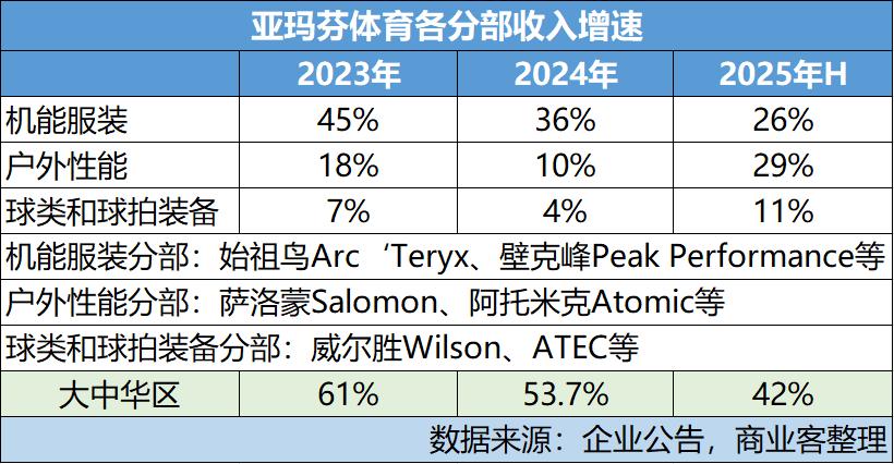 分部門看,包含始祖鳥Arc‘Teryx、壁克峰Peak Performance的機能服裝分部,收入同比增長26%;包含薩洛蒙Salomon、阿托米克Atomic的戶外性能分部,收入同比增長29%;包含威爾勝Wilson、ATEC的球類和球拍裝備分部,收入同比增長11%。