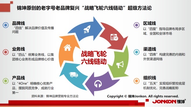 此外,中華老字號品牌的高端化升級之路是一個系統(tǒng)化工程,需要品牌線、產(chǎn)品線、渠道線、區(qū)域線、業(yè)務(wù)線、組織線六線核心問題的綜合診斷和建議,通過六線鏈動能夠切實帶動戰(zhàn)略飛輪真正運作起來,最終助力類似上海鳳凰這樣的百年中華老字號品牌高端化戰(zhàn)略真正落地,從而實現(xiàn)鳳凰的涅槃與再次騰飛。