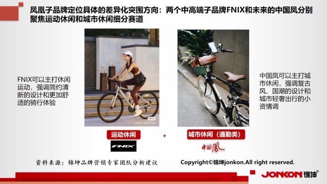 進(jìn)一步來說,F(xiàn)NIX可以主打運動休閑風(fēng),強調(diào)簡約清新的設(shè)計和更加舒適的騎行體驗;中國鳳可以主打城市休閑風(fēng),強調(diào)復(fù)古風(fēng)、國潮的設(shè)計和城市輕奢小清新的小資情調(diào)。