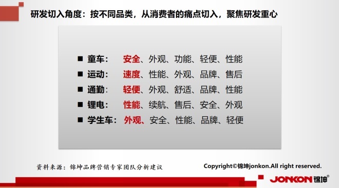 根據(jù)錦坤品牌營銷專家團(tuán)對電商平臺數(shù)據(jù)挖掘、消費者調(diào)研和企業(yè)內(nèi)部訪談,不同品類的消費者的前5個在意點如上圖所示。童車的安全、運動車的速度、通勤車的輕便、鋰電車的性能是未來各品類產(chǎn)品研發(fā)中最值得關(guān)注的點。