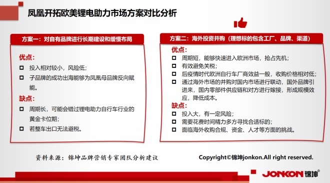 通過對上述上海鳳凰開拓海外市場的兩個方案進(jìn)行對比,我們發(fā)現(xiàn)各有利弊,但是從時間成本考慮,海外投資并購尋找包含工廠、品牌和渠道的理想標(biāo)的的優(yōu)點非常突出,有利于鳳凰抓住歐美鋰電市場的黃金時期進(jìn)行快速發(fā)展。錦坤品牌營銷專家團(tuán)建議可以在不放棄對自有品牌進(jìn)行長期經(jīng)營的基礎(chǔ)上積極尋求海外投資并購的機會。