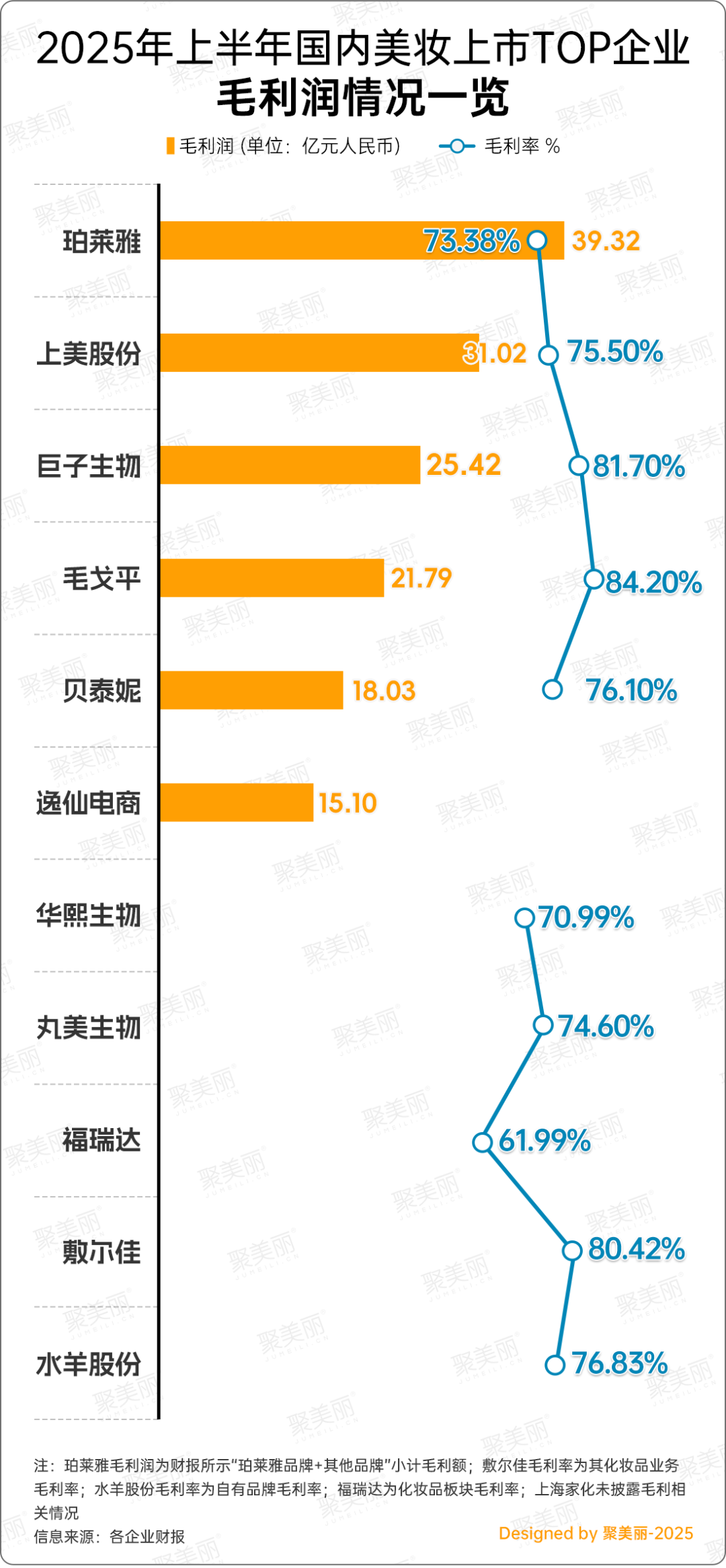此前,聚美麗在《收入39億毛利33億,毛戈平逆天了》一文中披露,毛戈平毛利率常年保持在80%以上。時(shí)至2025年半年報(bào),其綜合毛利率為84.2%,穩(wěn)居國(guó)貨美妝毛利率榜首,巨子生物、敷爾佳次之,毛利率同樣在80%以上,為81.70%、80.42%。