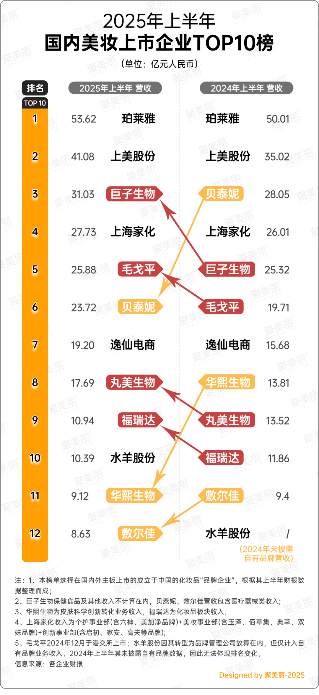 聚焦2025年上半年財(cái)報(bào),本次國(guó)內(nèi)美妝上市企業(yè)TOP榜發(fā)生了變化: