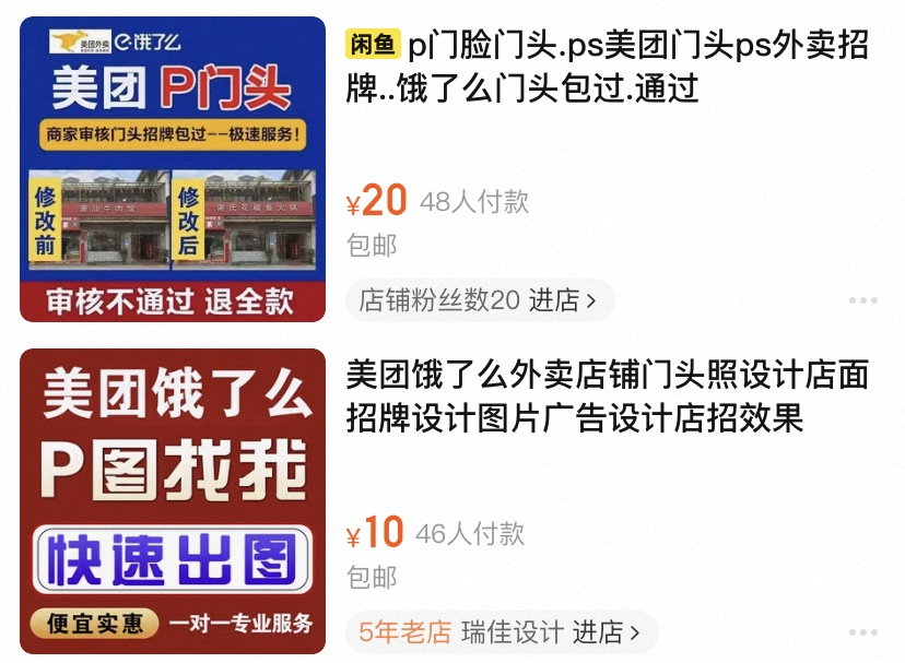 在淘寶等電商平臺,就有不少商家提供“P門臉門頭”“餓了么門頭包過”等服務(wù),價位在10元-40元不等,不少店鋪總銷量上千。除此之外,還有一些商家提供AI素材模板,從店鋪招牌到頭像logo再到菜品,應(yīng)有盡有。