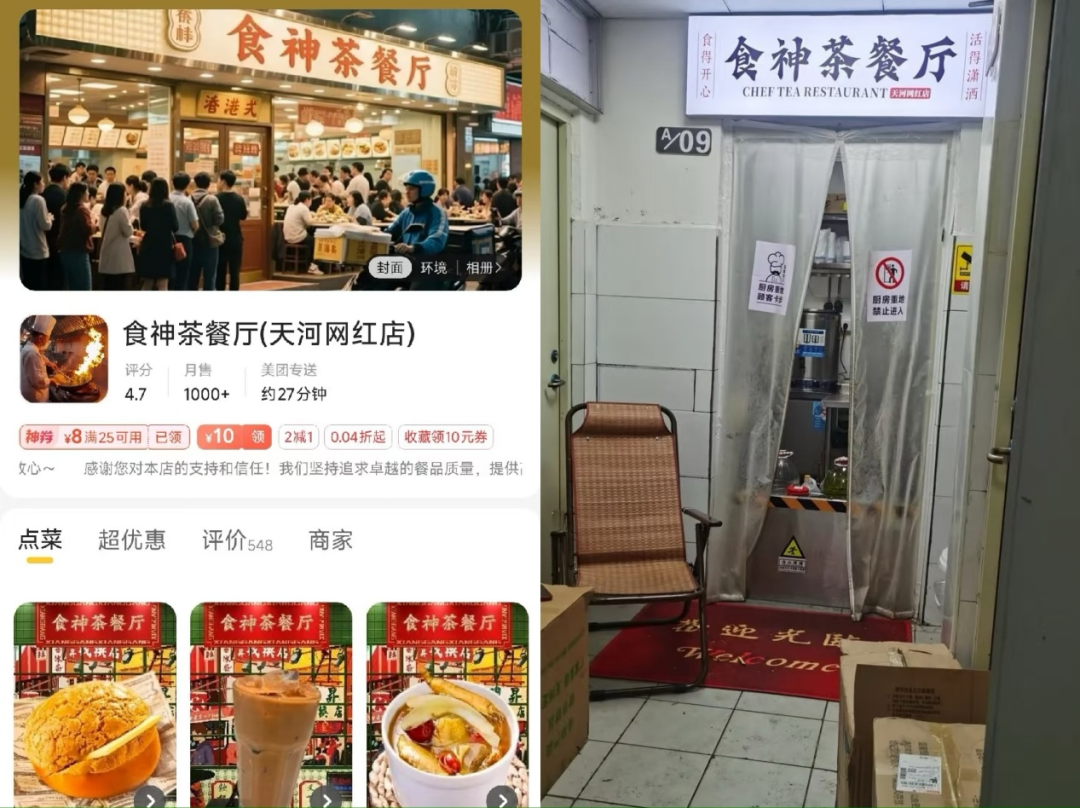 另有一名網(wǎng)友稱,“我以為的茶餐廳是正規(guī)軍,沒想到吃完后天塌了。”據(jù)其發(fā)布的圖片,平臺商家圖是顯而易見的AI圖,而實體店卻是狹窄的小作坊。在評論區(qū),有網(wǎng)友回復(fù)稱;“好崩潰,我很信任這些圖的,沒想到是假的”。