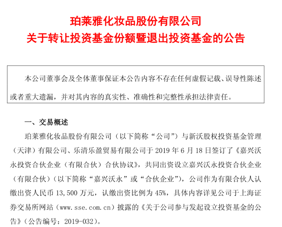 在此之前(今年6月),珀萊雅發(fā)布公告表示,基于公司投資戰(zhàn)略布局和未來(lái)發(fā)展規(guī)劃,經(jīng)各方友好協(xié)商后,決定退出此前參與設(shè)立的投資基金——嘉興沃永投資合伙企業(yè)(有限合伙),并將其持有的全部份額轉(zhuǎn)讓給浙江大稻啟運(yùn)集團(tuán)有限公司。