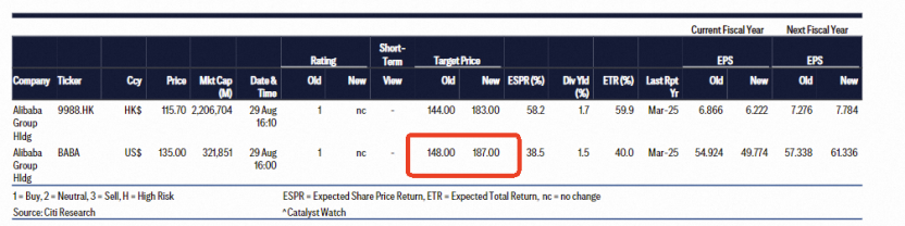 花旗銀行同樣大幅上調(diào)阿里巴巴目標價,從148美元(約合1057元人民幣)到187美元(約合1336元人民幣)。其研報認為,自4月底開始投入以來,淘寶閃購已取得顯著進展,包括日訂單峰值達到1.2億單,8月周均訂單量約8000萬,月活躍用戶同比增長200%至3億。