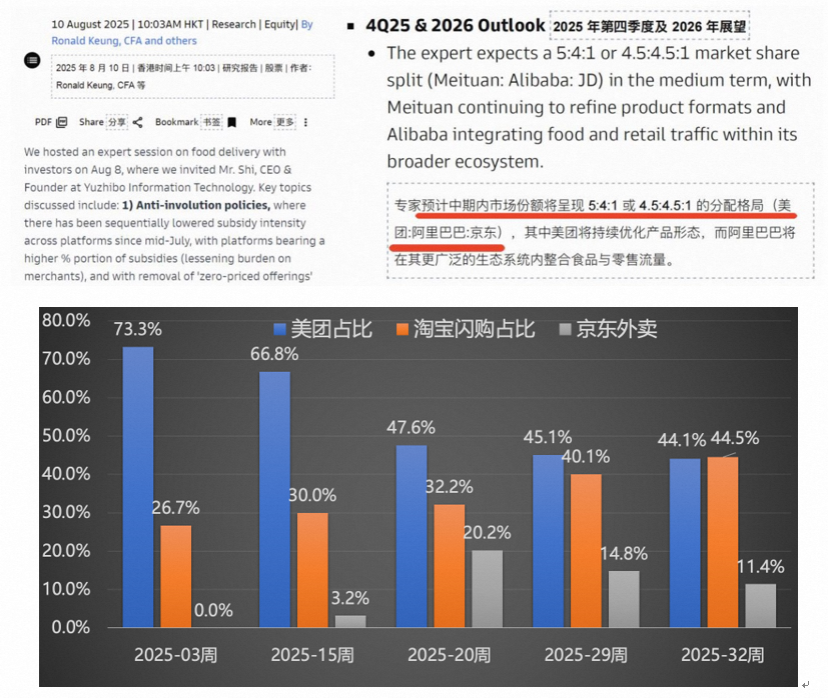 對此,高盛在8月10發(fā)布的專家訪談分析認為,外賣行業(yè)的競爭已經(jīng)改變市場格局,淘寶閃購有望獲得45%的市場份額,并認為5月以來外賣行業(yè)競爭加劇,導致美團的季度的虧損超過預期,其長期市場份額或?qū)⒂谰孟陆怠?/p>