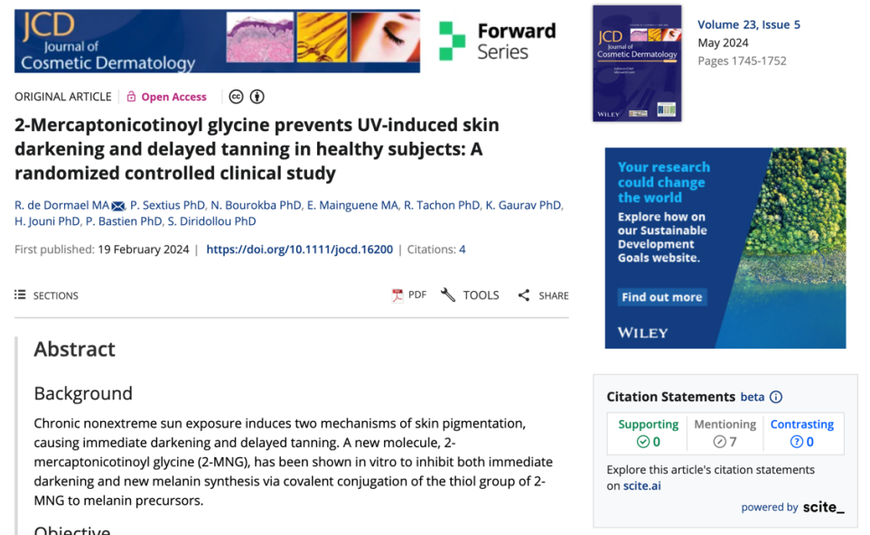 作為資生堂的王牌美白成分,自2003年獲得日本厚生勞動省批準(zhǔn)以來,已在護(hù)膚品中應(yīng)用超過20年。然而,其詳盡的科學(xué)機(jī)制和臨床數(shù)據(jù)直到近期才由資生堂團(tuán)隊(duì)在《Journal of Cosmetic Dermatology》上首次公開發(fā)表,該文章不僅系統(tǒng)性地驗(yàn)證了4MSK的功效,更重要的是,它清晰地描繪了一個(gè)“抑制生成”與“加速代謝”雙通路協(xié)同的美白范式。