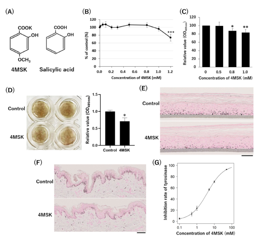 無論是在培養(yǎng)的人類黑色素細(xì)胞、3D表皮模型,還是離體人體皮膚外植體中,4MSK均顯著降低了黑色素含量。例如,0.8-1.0mM的4MSK能在不影響細(xì)胞活力的前提下,有效減少黑色素生成。