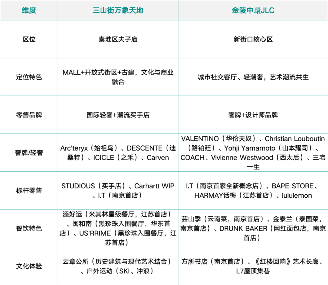 同樣都是南京核心商圈的輕奢項目,JLC與三山街萬象天地兩者被比較是必然的,雖同處南京重要商圈且都側(cè)重體驗與年輕化,但二者的定位邏輯、品牌組合及競爭優(yōu)勢存在顯著差異。以下是對比分析: