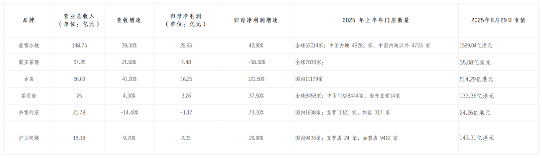 2025年上半年,在深度參與外賣大戰(zhàn)的新茶飲品牌中,除奈雪的茶之外,古茗、滬上阿姨、茶百道、蜜雪均實現(xiàn)了營收與利潤的雙重增長。