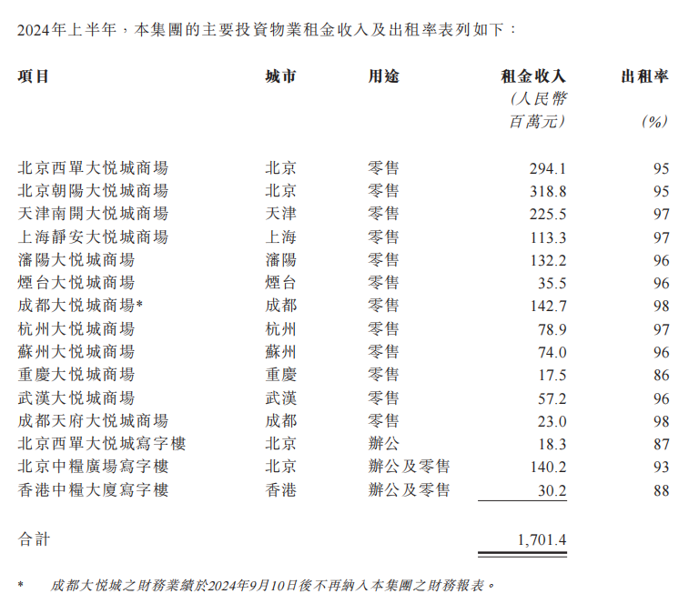 去年上半年,大悅城地產(chǎn)主要投資物業(yè)的租金收入為17.014億;
