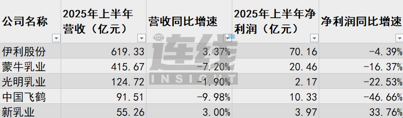 從液態(tài)奶收入占比較高的幾家企業(yè)來看,2025年上半年,伊利、蒙牛、光明、新乳業(yè)的液態(tài)奶收入分別為361.26億元、321.92億元、66.05億元和50.67億元,占總收入比例分別為58.33%、77.4%、53%和91.70%。