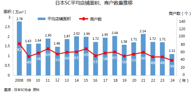 從SC單體面積、商戶(hù)數(shù)量演變看,除了2008年為2.78萬(wàn)m²、2012年為1.48萬(wàn)m²較為特殊以外,其它多數(shù)年份在1.6至2萬(wàn)m²之間,2024年顯著減少,與前一個(gè)年度GMS等較大主力店鋪關(guān)閉有一定關(guān)系。不管怎樣,店鋪面積在縮小已經(jīng)形成趨勢(shì)。與此相對(duì)應(yīng),店鋪的商戶(hù)數(shù)量也在減少。